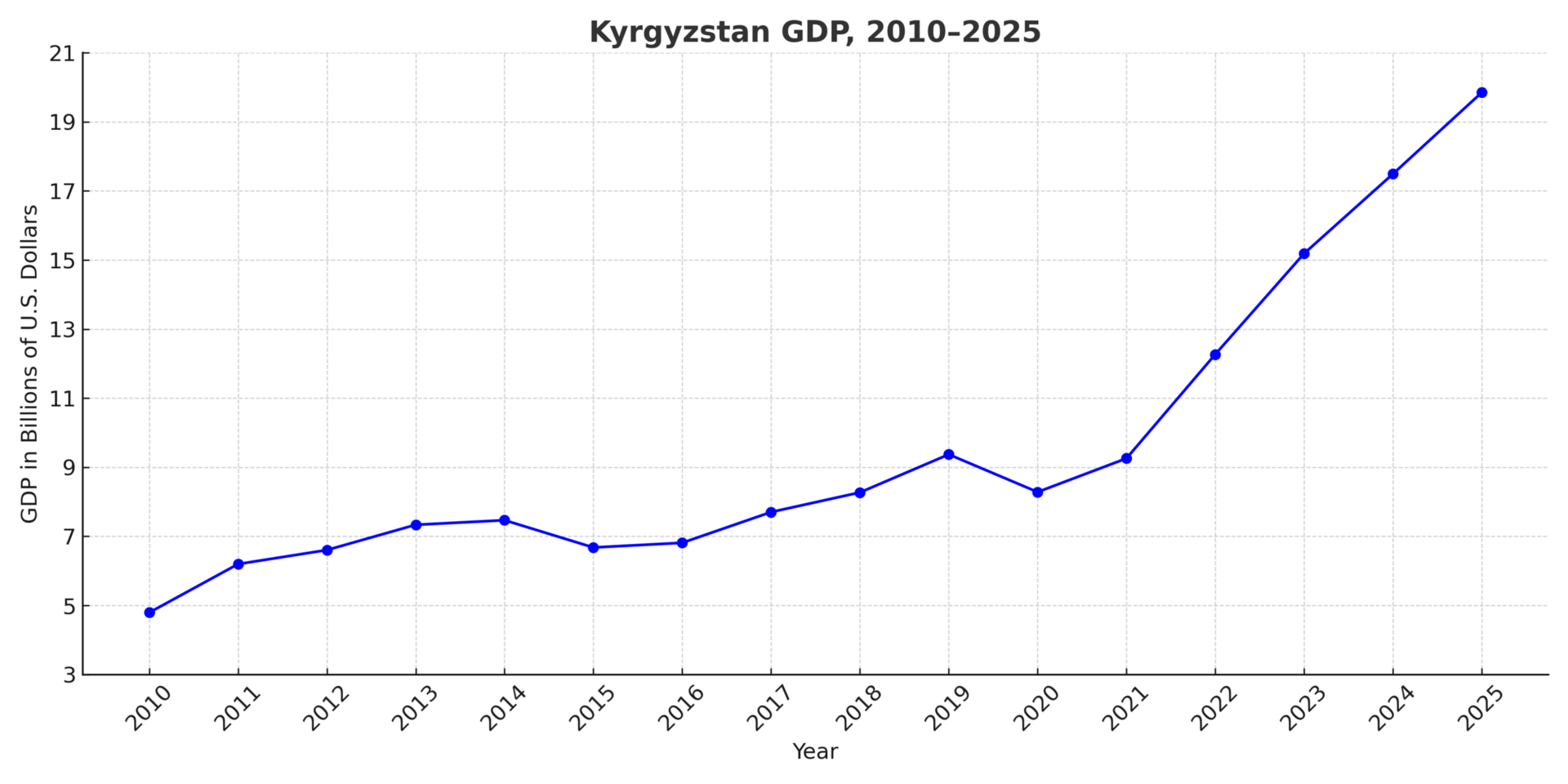 The war’s uncertainty and geopolitic turmoil, have driven a meteoric rise in price the price of gold, boosting Kyrgyzstan’s largest traditional export. Meanwhile, because Kyrgyzstan and Russia share customs-free zone under the EAEU, the country has become a hub for re-exports and trade arbitrage — funneling goods (some under sanctions) into Russia.